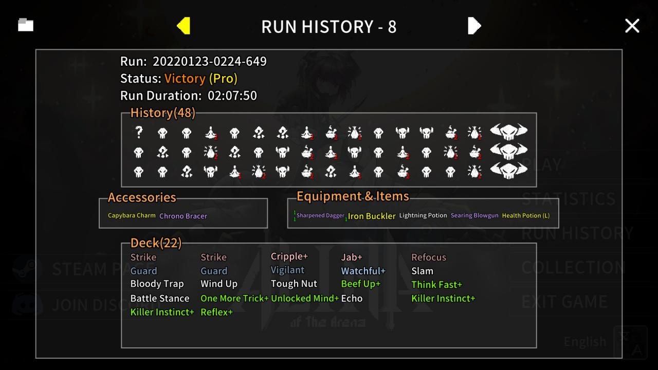 If I were to play this build again, I’d tone down on the non-combat cards (removing either Echo or Unlocked Mind for certain), and remove more of the basic Strikes and Guards. I would also take an additional movement option or a crossbow for range.