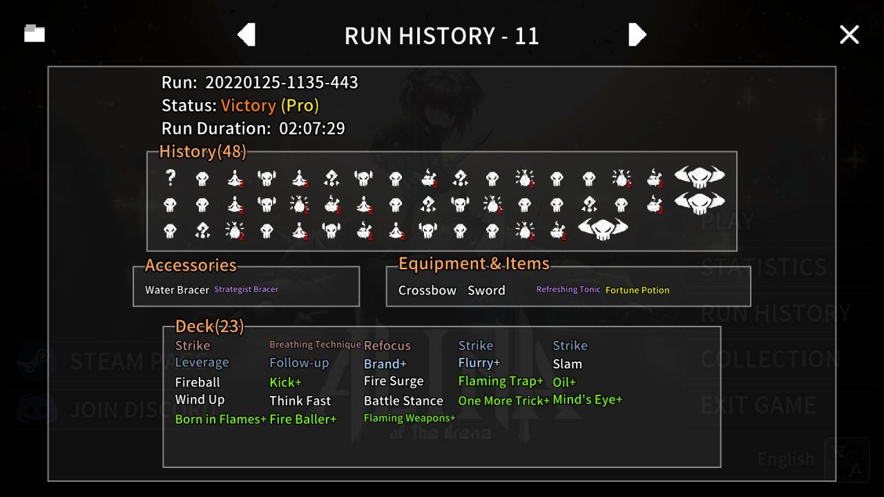 You’ll notice that I only took Refocus and Breathing Technique as block options here, and in truth I took them only for their deck control potential. (Born in Flames was taken because by the endgame I was setting most of the arena on fire.) Given that my previous skirmisher builds still provided fair to large amounts of block, I thought it might be nice to try a build that was undeniably not dependent on block to survive. But that did necessitate taking Mind’s Eye to avoid the final boss’s judgement attack, as flame damage does not decrease block.