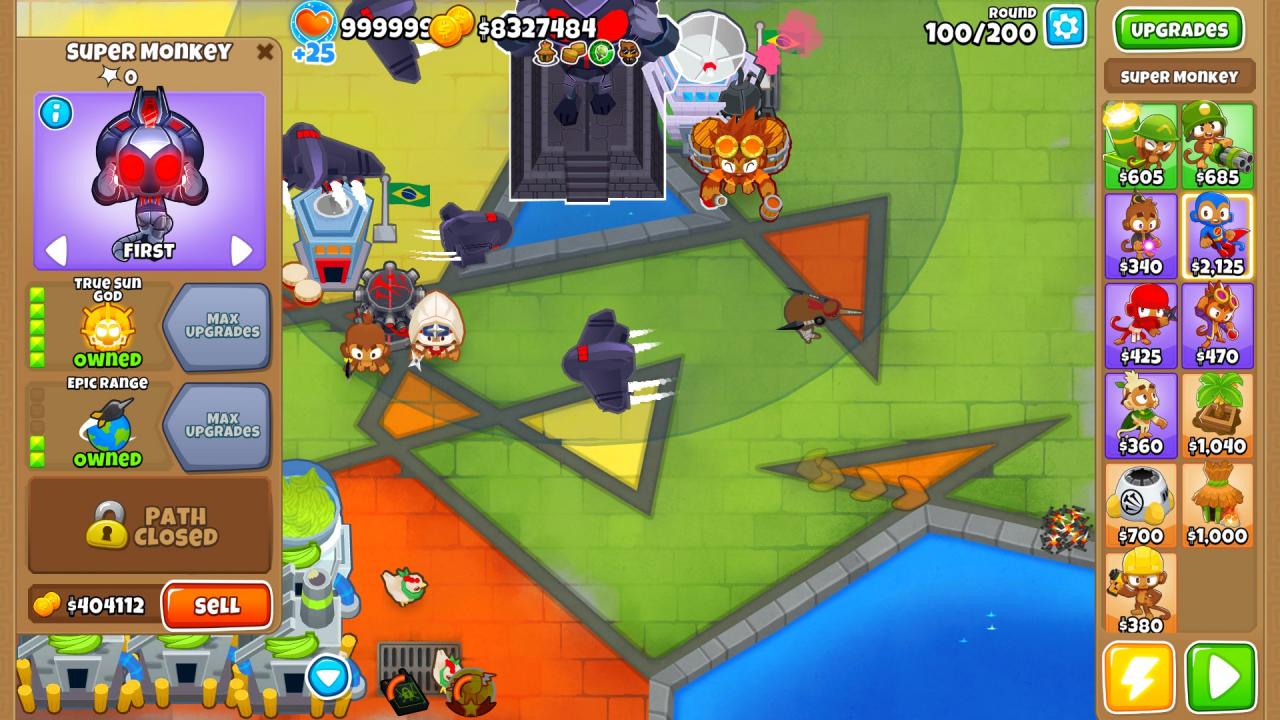 Next get the 050 and 005 Super Monkeys, you can place them near the entrance so they help with the DPS. Just make sure they are outside of the Temple’s range