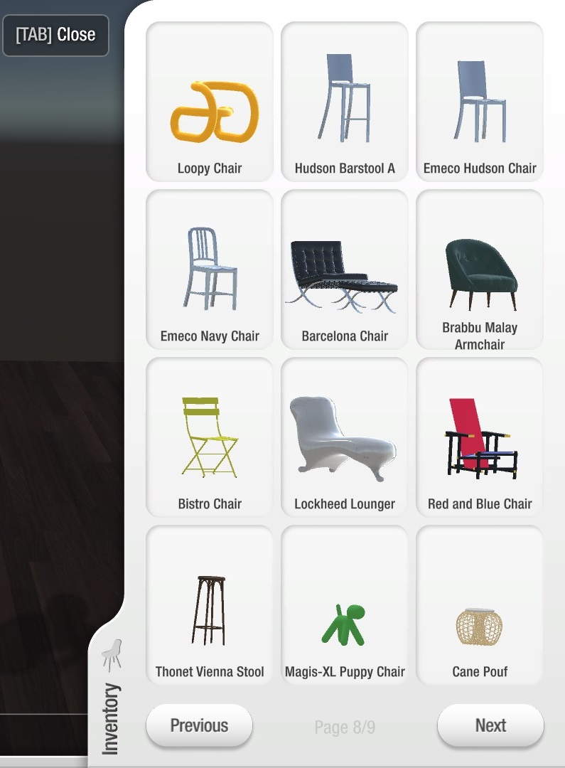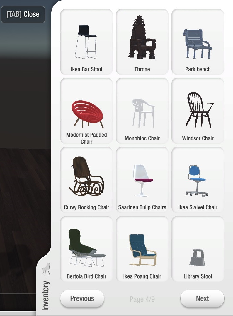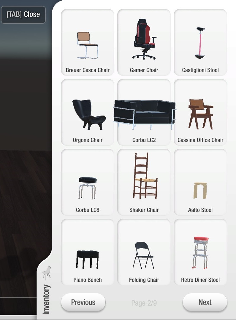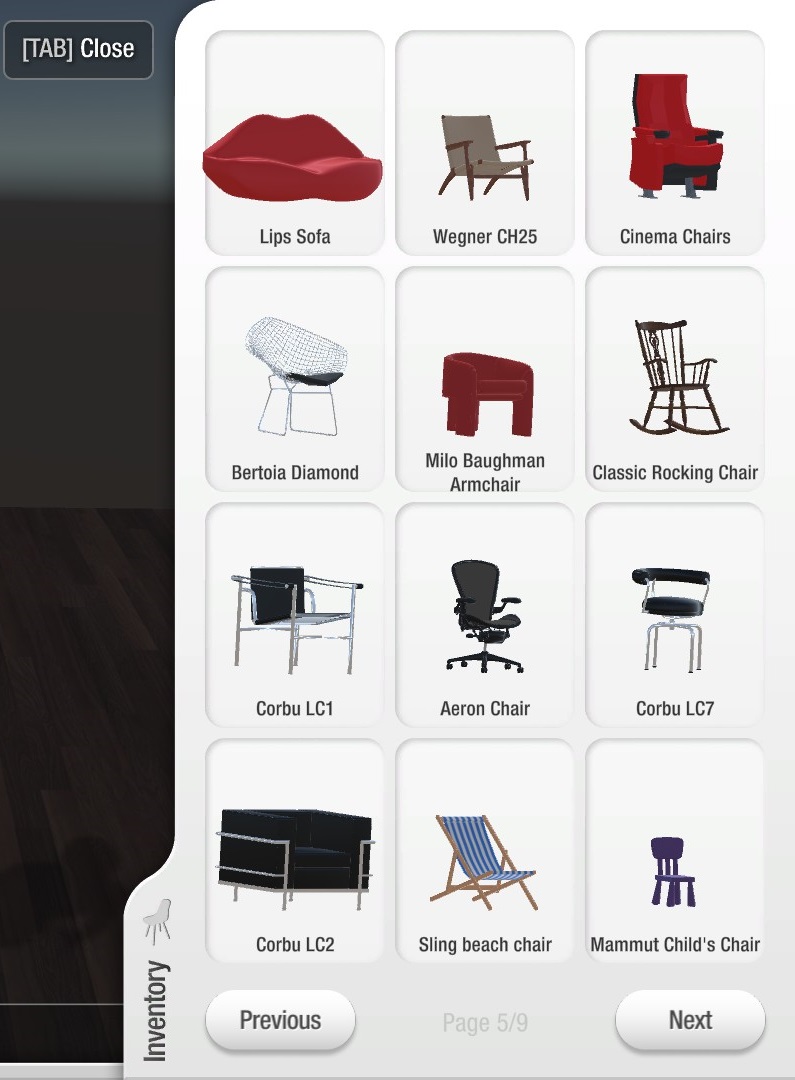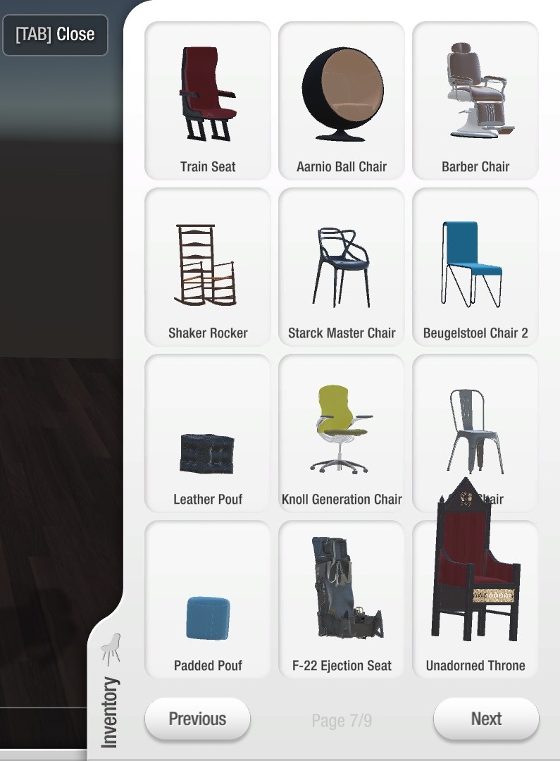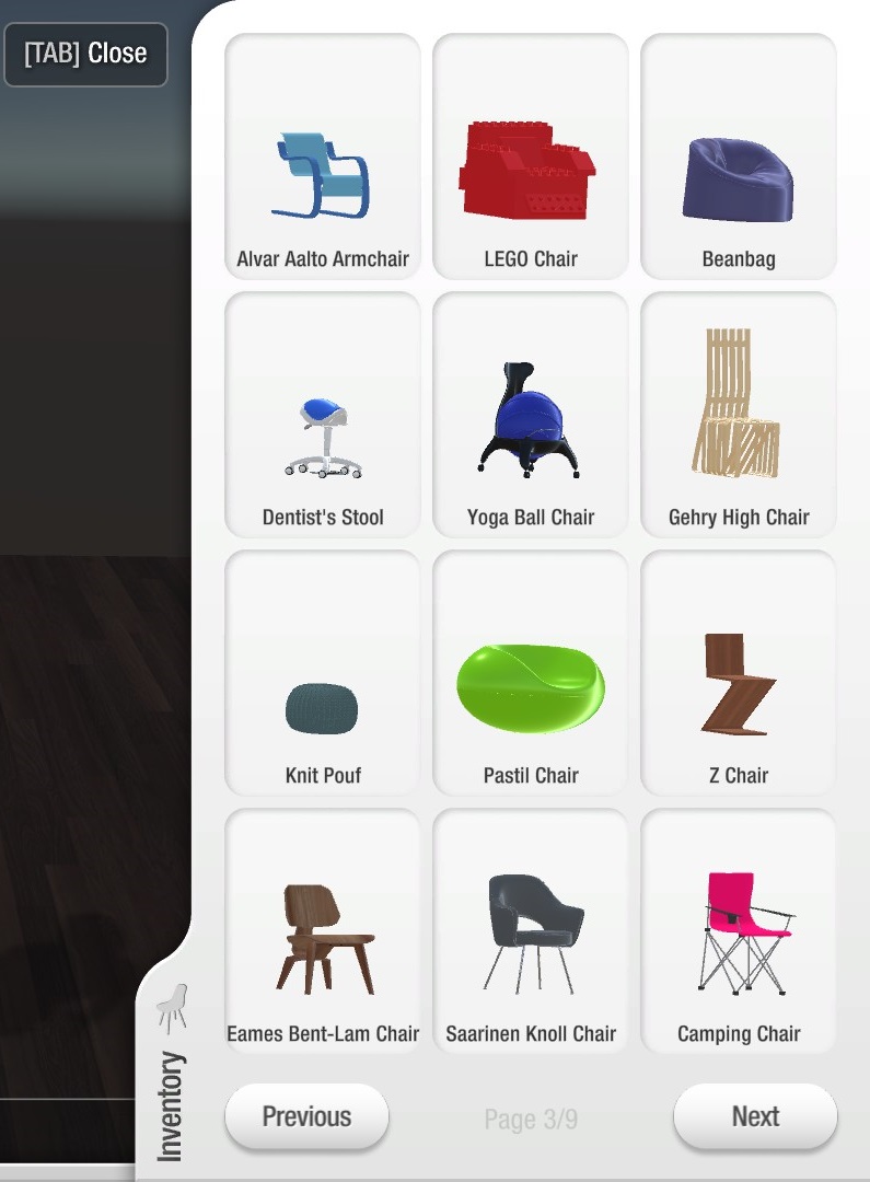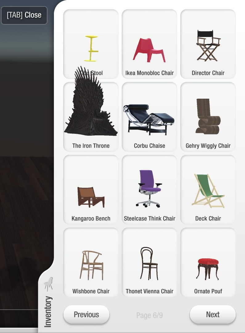 Egg Chair, Saarinen Womb Chair, Corbu LC2, Eames Bent-Lam Chair, Monobloc Chair, Curvy Rocking Chair, Lips Sofa, Wegner CH25, Cinema Chairs, Aeron Chair, Corbu LC2, The Iron Throne, Corbu Chaise, Gehry WIggly Chair, Kangaroo Bench, Steelcase Think Chair, Wishbone Chair, Thonet Vienna Chair, Aarnio Ball Chair, Shaker Rocker, Starck Master Chair, Knoll Generation Chair, Emeco Hudson Chair, Barcelona Chair, Eames Molded Armchair, Eames Lounger