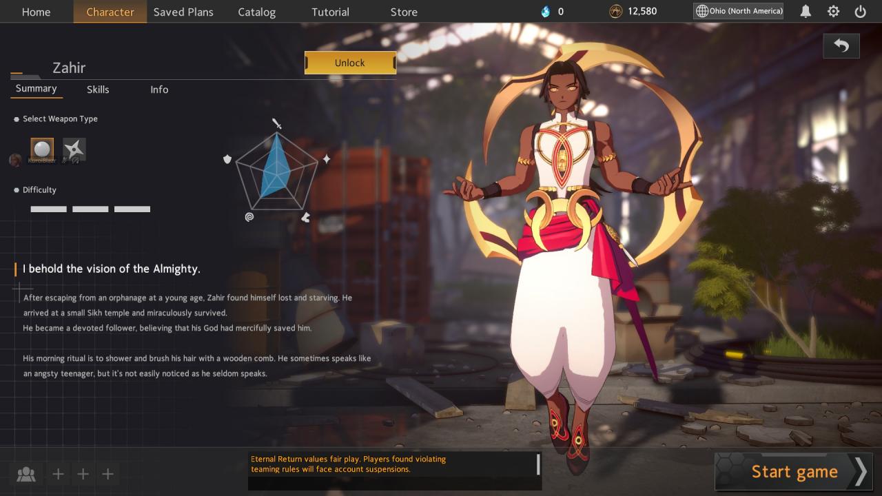 This is number two due to the long cooldown and slow projectile speed of Zahir’s Vayvayastra (E Skill). Vayvayastra is your only source of hard CC (with a relatively long cooldown). This makes catching characters with dashes or move speed steroids a bit more difficult without the use of baiting or zoning. (Jackie, Aya, Hyejin, Fiora, etc) Zahir has an extremely slow movement speed. (Among the slowest in the cast) - Defense: