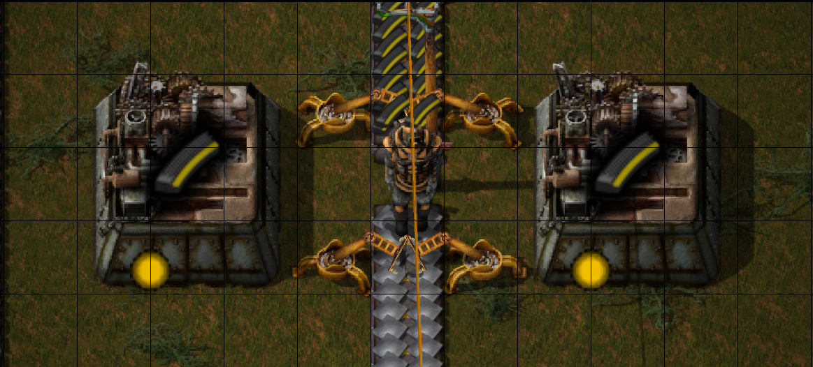 The output of this ammunition factory is then merged onto a single belt by means of a T-section, forcing it to occupy only one side of a belt. The other side of the belt is for coal.
