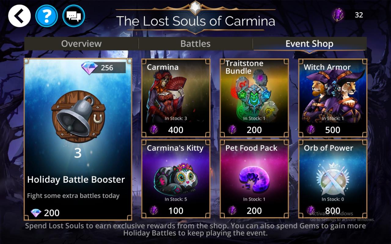 This is a new holiday themed event (so we can expect same one start by NY for example). The event lasts 14 days starting from 24/X/2022. Every day 3 free battles are available. If desired, it is possible to purchase additional battles starting at 50 [Gems] for 3 battles. However every next purchase of the additional 3 battles would cost 50 [Gems] more than the previous one, meaning that the first purchase costs 50 [Gems], 2d one will be 100 [Gems], 3d – 150 [Gems] and so on).
