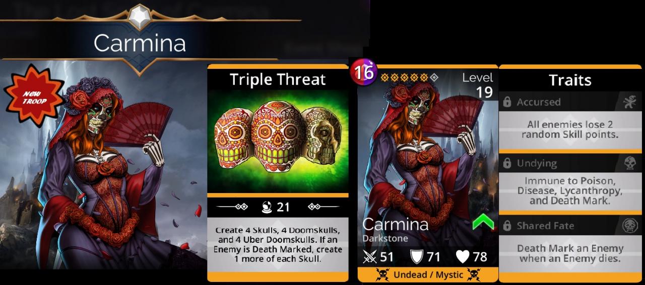[Carmina]’s attack ability is called {Triple Threat} and it creates 4 Skulls, 4 Doomskulls, 4 Uber Doomskulls and creates an additional 1 Skull of each type for every deathmarked enemy, meaning that it has a potential of creating up to 24 skulls which are going to be 8 common Skulls, 8 Doomskulls and 8 Uber Doomskulls, given that all the enemies are under the {Death Mark} status effect.
