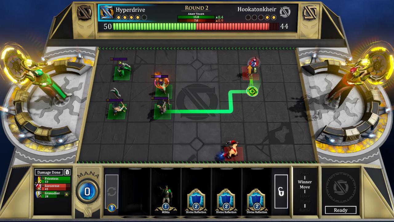 - Shop: Play units and powers from the shop onto the board. Duplicate copies of the same unit or power can be stacked to upgrade them.