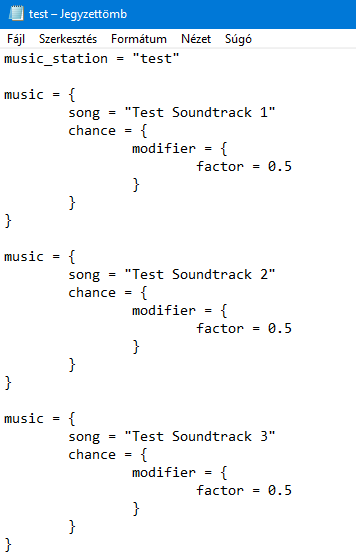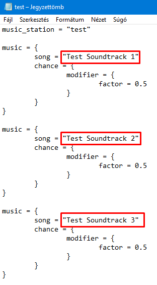 - “name = “Test Soundtrack 1” (Write here the title of the song which will appear in the Radio Station)