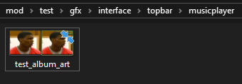 Rename it like “test_album_art” when it is inside your mod’s “gfx\interface\topbar\musicplayer” folder (Example) (Mine album art is already edited, you will have to edit yours yourself)