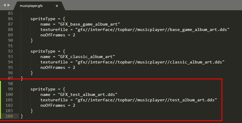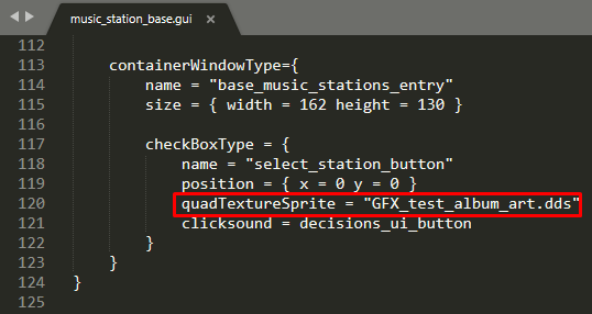 quadTextureSprite = “GFX_base_game_album_art”, Change “GFX_base_game_album_art” like this “GFX_test_album_art.dds” (Example)