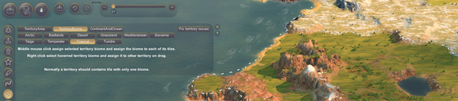 To determine which biome applies to each territory, zoom in back to a closer view of your map. Click on the “TerritoryBiome” tab, then select a biome and middle click on the territory you wish to apply this biome to.