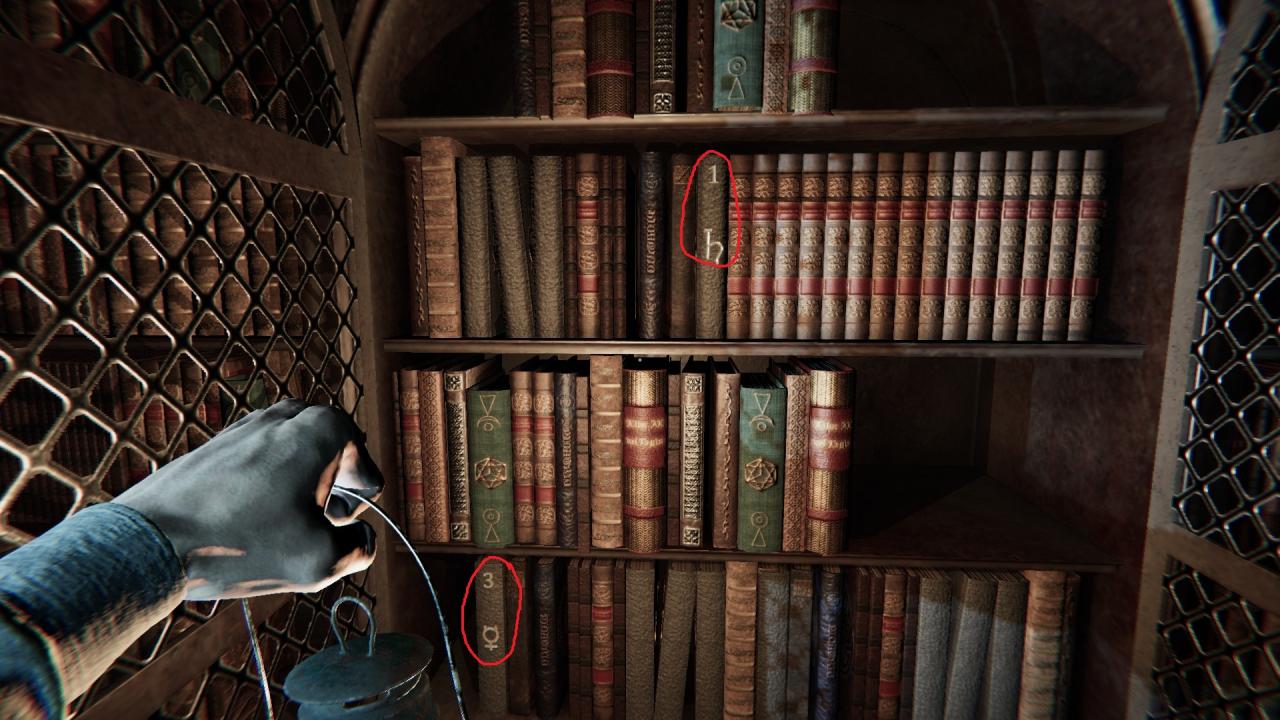 Then we go to the library on the 1st floor. Some books will have numbers and symbols underneath them. And we are looking for books in accordance with the code from the first screenshot (3410). (0 there is no book).