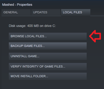 Right-click on Mashed from the Steam Library. Right click on it, select Properties, then Local Files. Next, click on the Browse Local Files option. This should open a new window in your Windows Explorer.