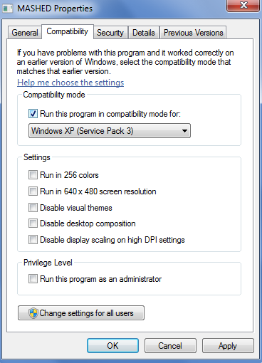 Open the Compatibility menu, check the box, and run the program in compatibility mode for Windows XP (Service Pack 3). Click Apply, close the window, and launch the game.