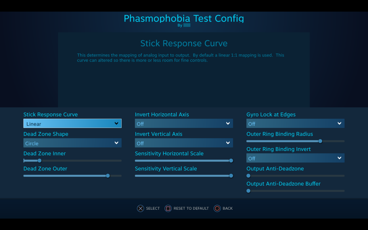 I chose to move the Dead Zone Outer a little to the right of default. I find it useful to have an inner deadzone. Warning: without an inner deadzone you may encounter an issue with being unable to control movement. Also, movement in Phasmophobia is either on or off. It does not matter if you move the stick a little or at maximum, you move the same speed throughout.