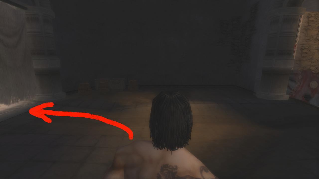 You should see a hole in the wall covered by a curtain. Make your way into that and continue to the fountain. If you go up instead, you will continue the story.