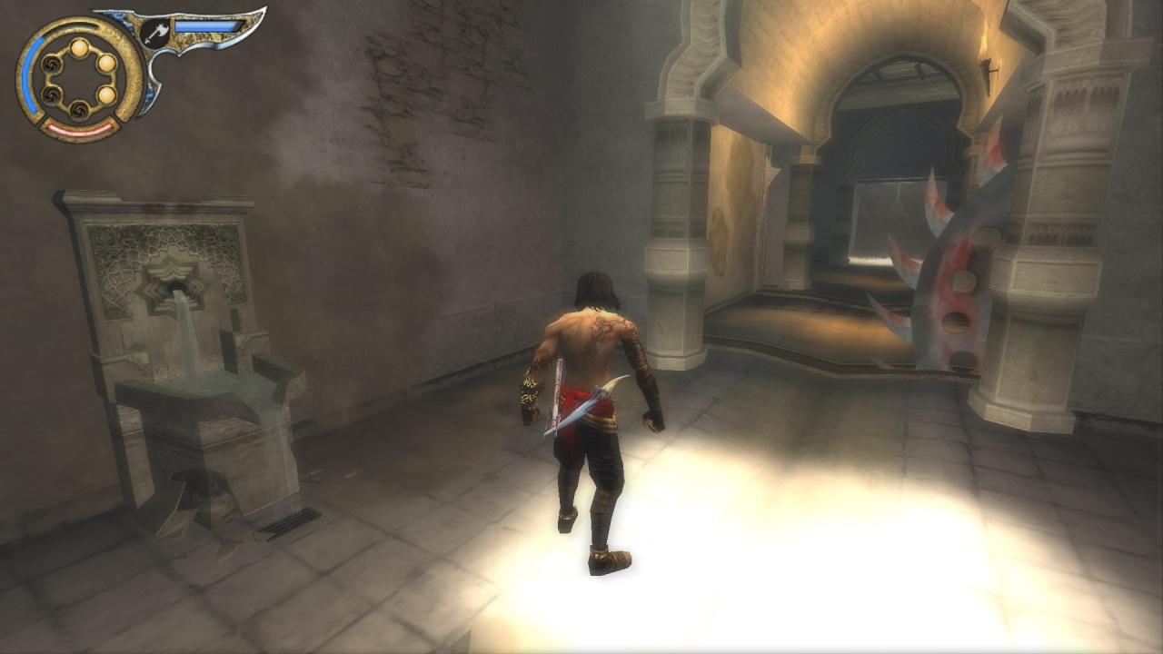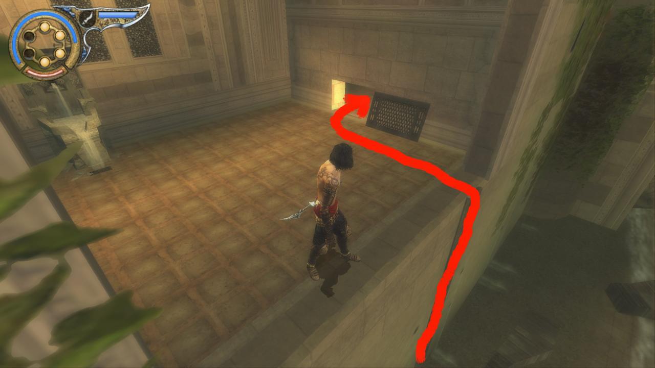 This is right after the save fountain called ‘The Temple’ which is right in front of a door with a dagger switch. When you go through and get to a balcony, you see the vizier cut down one of Babylon’s guards and you will become the dark prince. Then you fight and jump your way to a room, where you see the vizier leave. You will once again become the normal prince since the room is filled with water. This is the room where the upgrade is. Turn the lever to drain the water and climb up the pole. Run along a wall untill you are on the swinging poles.