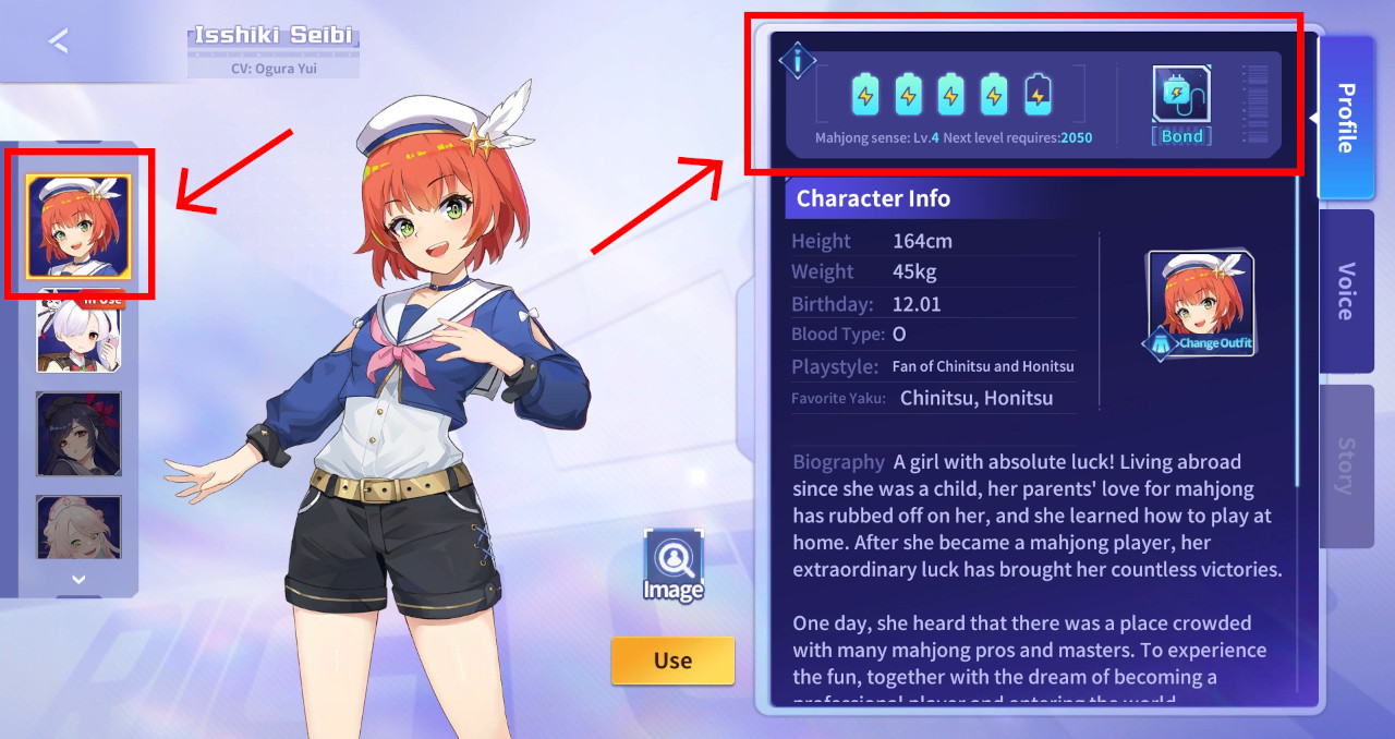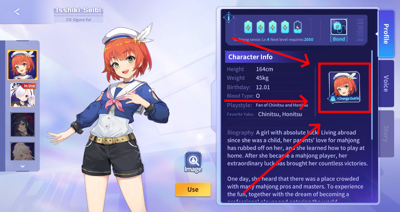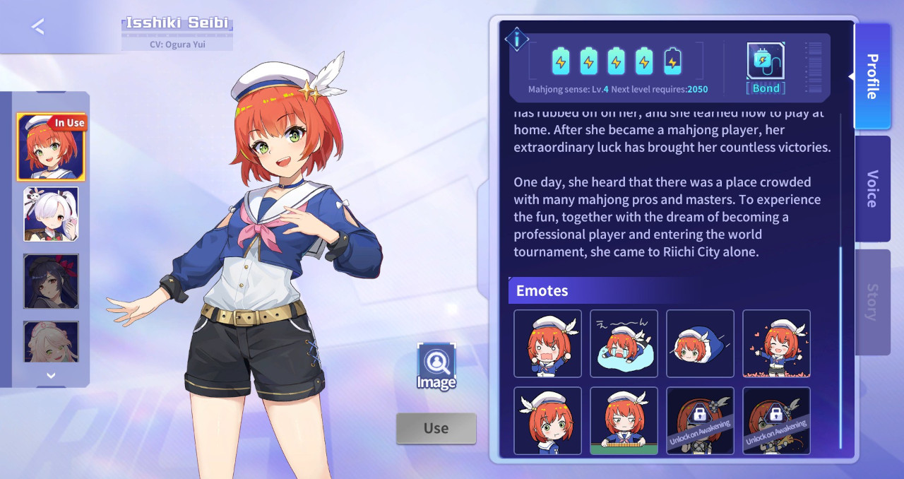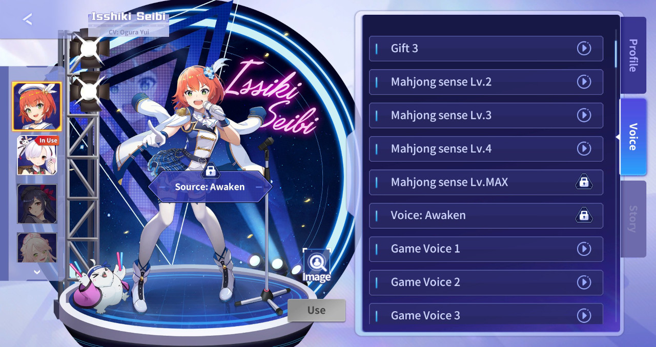 For the voice lines, hit the “Voice” tab and scroll down a little bit and you can find all the voice lines that get unlocked by increasing mahjong sense.