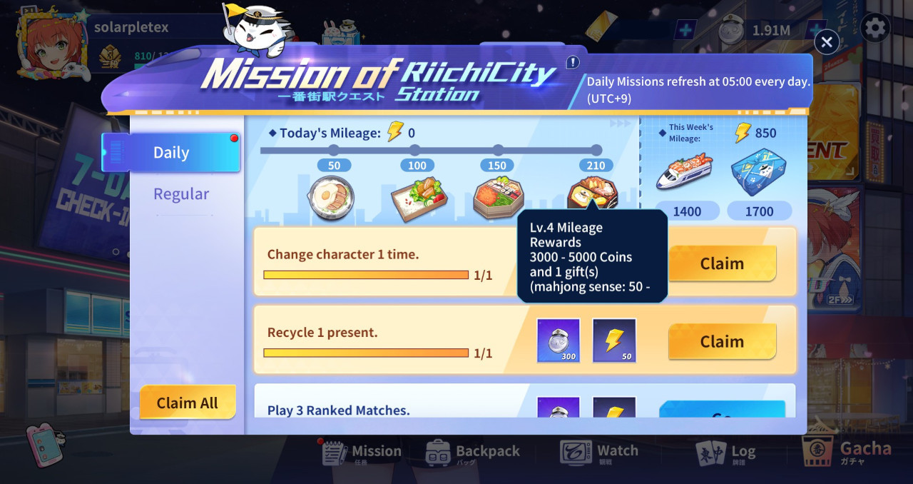 Often times, Riichi City will have events going on. These events will often have their own daily missions to do which reward event points. You can use these event points to buy special event items from the event shop and also gifts. Each event is different so make sure to check the info boxes for details on how to get event rewards.