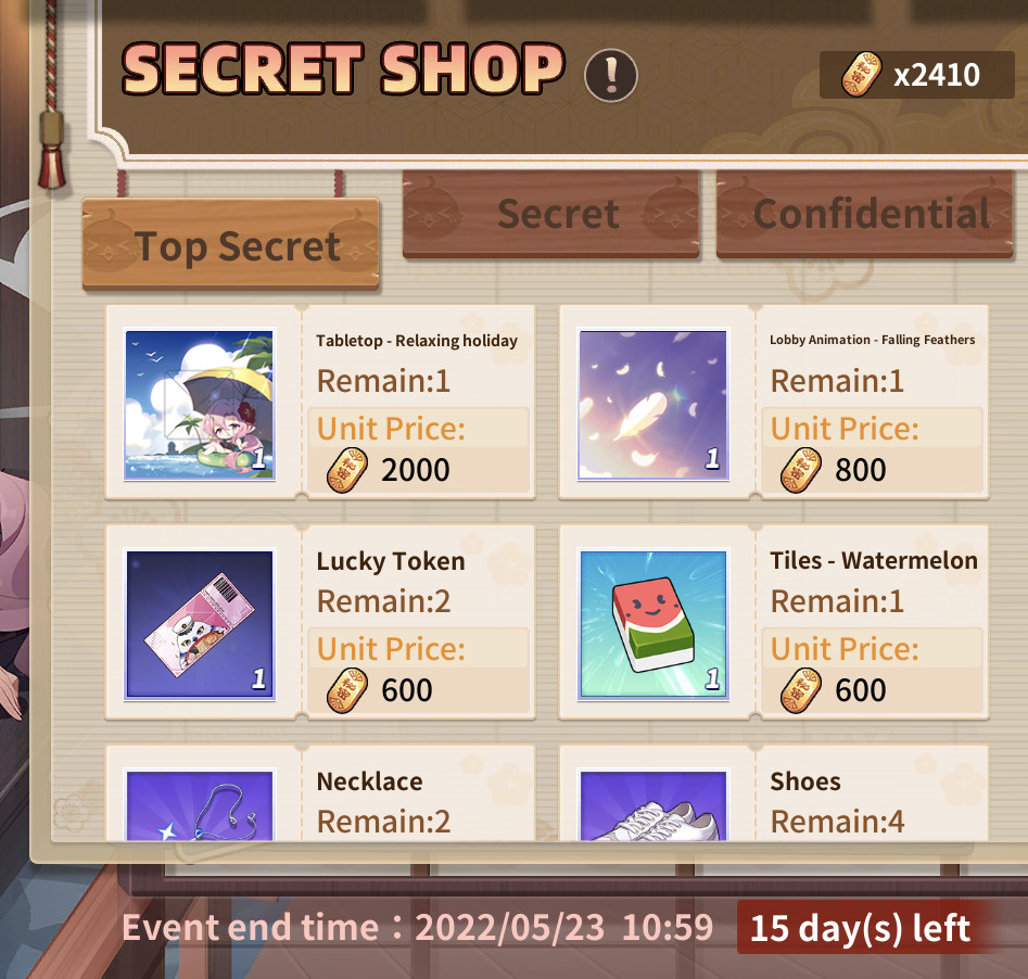 Here you will see a selection of six (6) gifts and two (2) books you can buy with coins. The more mahjong sense a gift gives, the more it will cost. This is a limited selection that changes daily, so don’t worry if you don’t see the gift or book you want. You can just come back in 24 hours when the shop restocks. For a full table of prices, you can check Appendix A.