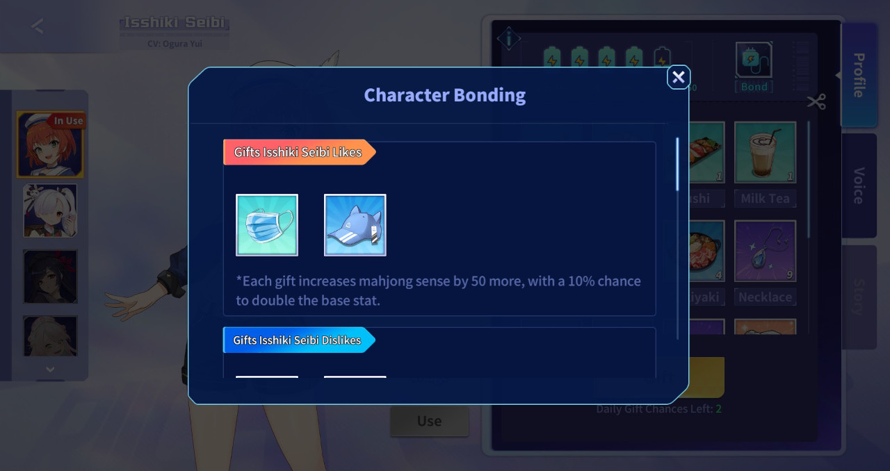 If you click on the info box diamond by the bond level, it will bring up info on what kind of gifts the character likes and also the kinds of gifts the character dislikes. Gifts that a character likes get a +50 mahjong sense bonus, and also a 1% chance to double their base mahjong sense value. Gifts that a character dislikes will have a -50% penalty to mahjong sense value.