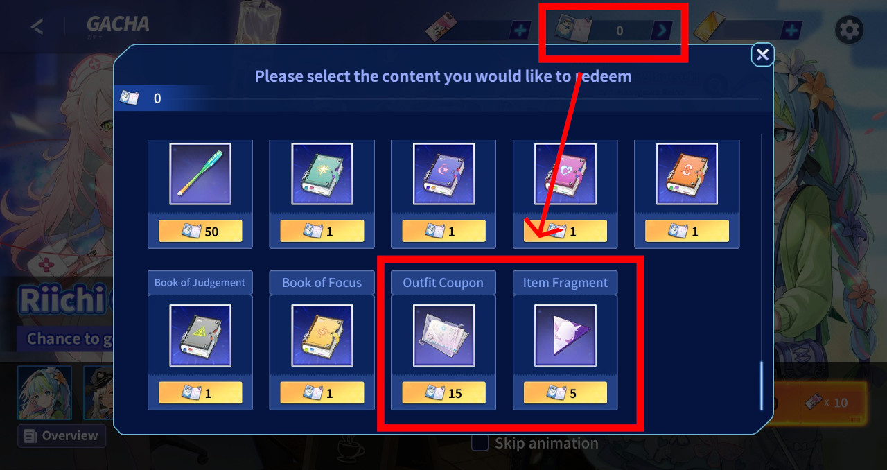 Thankfully, you don’t have to roll too much on the gacha to get enough for Awakening a character. Every time you roll on the gacha (using either the free ticket or real money), you automatically get a Stamp Card of Gacha item. If you click on the stamp card counter at the top right of the screen, you can open a mini shop where you can skip the gacha and buy what you want directly using these Stamp Cards.