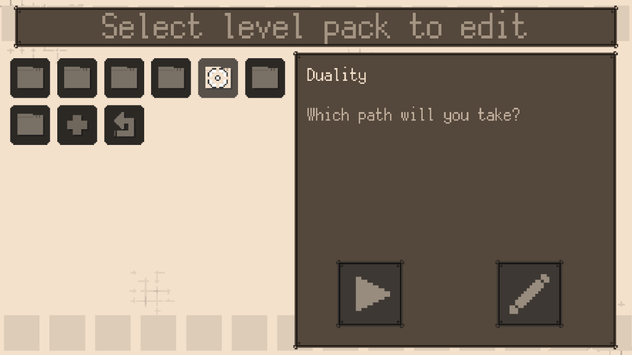 After clicking on “Level Editor” when you start the game, you should eventually get to this screen. The plus sign is to create a new level to start editing. Existing levels appear as folder icons. Clicking on the folder icon should bring up the level’s name and description. The play icon starts the level for you to play. The pencil icon lets you edit the level.