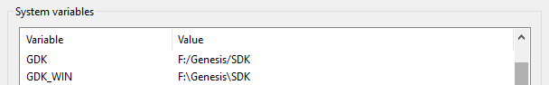 In the window, simply click “Environment Variables…” to open the window. Now you’ll need to make the variables. These variables will be System variables, not User variables. For GDK_WIN, simply copy the path you extracted it to, i.e. F:\Genesis\SDK. As for the GDK variable, this is setup the same way, however the difference is that this needs to be a UNIX path. Luckily, all you need to do to convert it is to replace every backslash ( \ ) with a forward-slash ( / ) like in the screenshot below