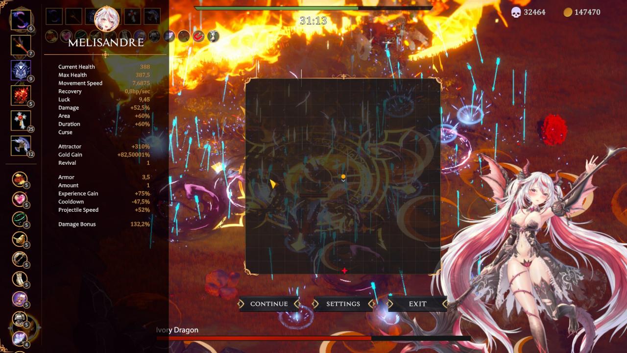 Passive – in order to maximize her passive effects you’l need to remove all points from your Magnet and don’t pick Magnet item at all. Gather a big chuck of EXP with her dash and also correctly time it’s usage with the green sphere (which collects all gold/exp on the map). With this you can reach like level 120 by the end of the map.