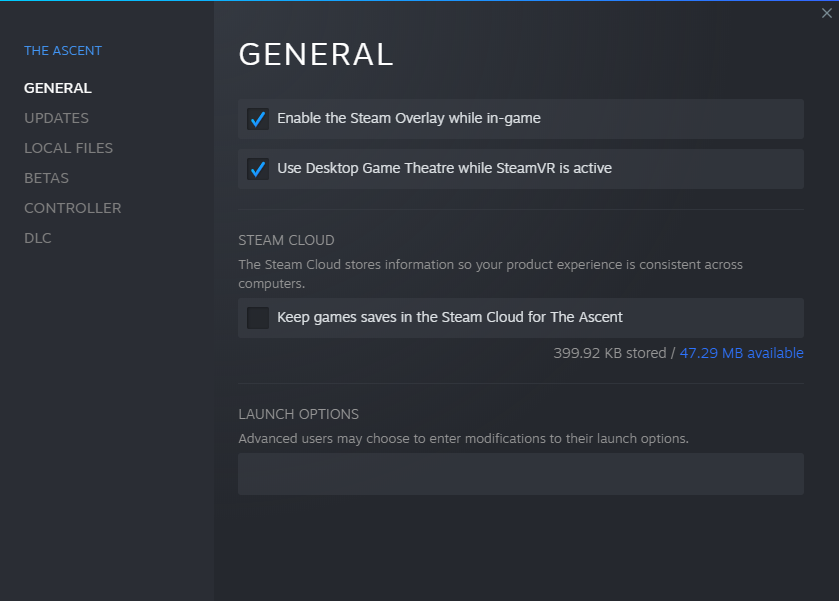 Right clicking The Ascent in your Steam game library -> Left clicking Properties -> General tab -> Un-check the “Keep games saves in the Steam Cloud for The Ascent” under Steam Cloud
