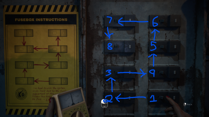 You will play as Jamie, Make your way through the doors (explore as you wish) until you find a keypad on the wall (which is connected to a door, blocking the Fuse Box)