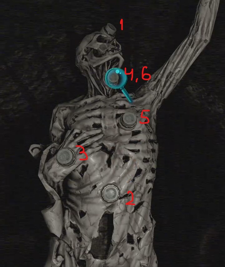 Once you access the Experiment Room in the Basement, there will be a skeleton with buttons on it, and a plaque with a riddle. Press the buttons in the following order to unlock a secret passage: