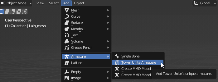 • In Object mode click Add -> Armature -> Tower Unite Armature
