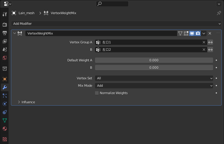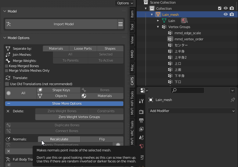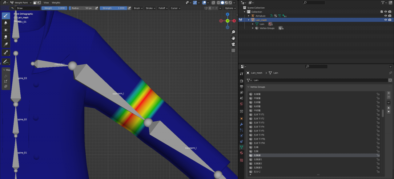 There will be multiple groups with the same name, but we will handle this later, let Blender do it’s thing with .001 naming (or be creative). If you come across illogical weighing or invisible things, remove the group. Note that depending on the complexity of the model the selected group might be on the back or in some weird spot so check the model from every angel before removing. Or translate the name of the group if you’re unsure.