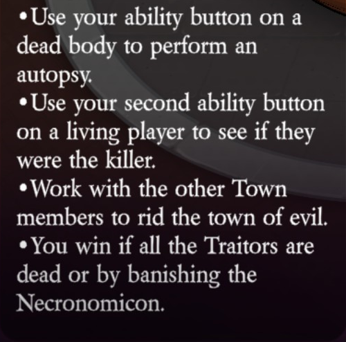 Uses their ability button on a dead body to perform an autopsy. Uses their second ability button on a living player to see if they were the killer.