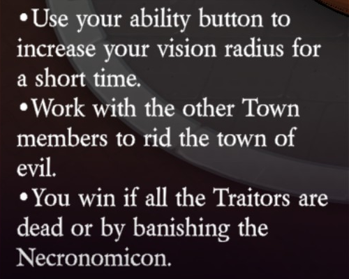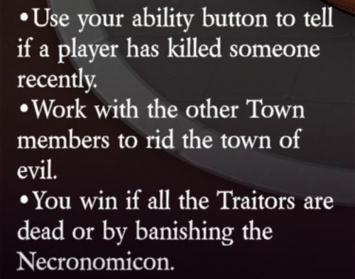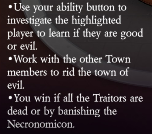 Uses their ability button to investigate the highlighted player to learn if they are good or evil (1 use).