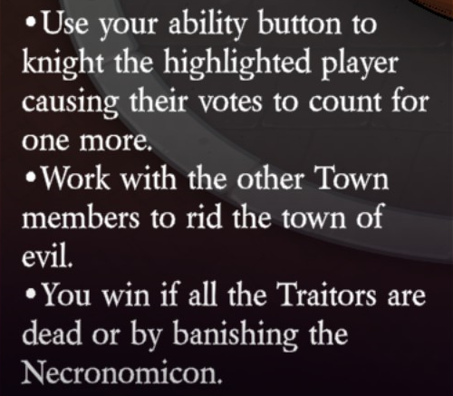 Uses their ability button to knight the highlighted player causing their votes to count for one more.