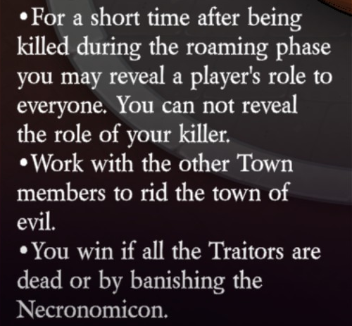 For a short period of time after being killed during the roaming phase they may reveal a player’s role to everyone. They can not reveal the role of their killer.