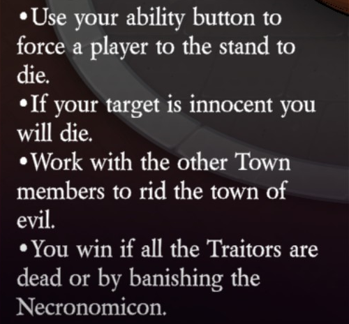 Uses their ability button to force a player to the stand to die (1 use, 10 second duration). If their target is found innocent they will die.