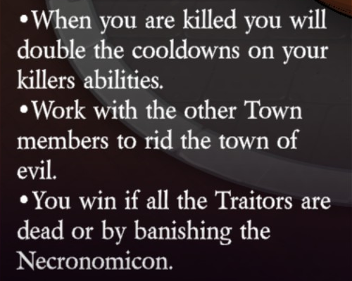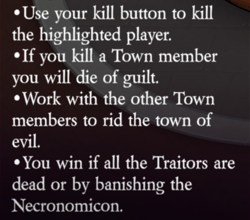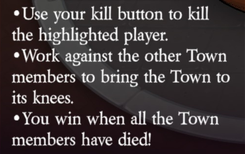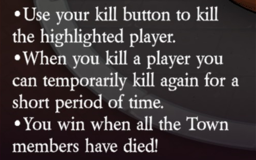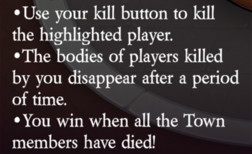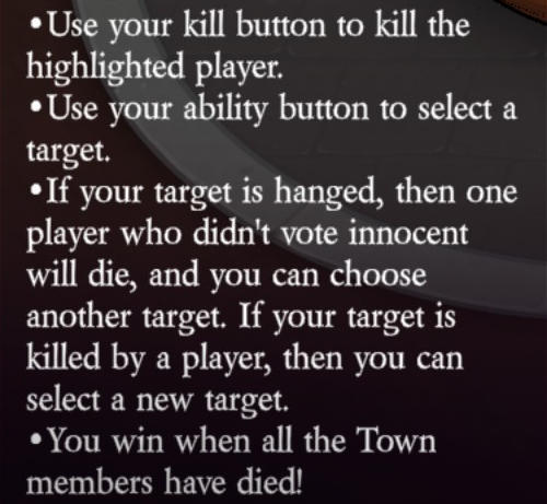 Uses their kill button to kill the highlighted player (unlimited uses). Uses their ability button to select a target. If their target is hanged, then one player who didn’t vote innocent will die (via Doom: automatically), and they can choose another target. If their target is killed by a player, then they can select a new target.