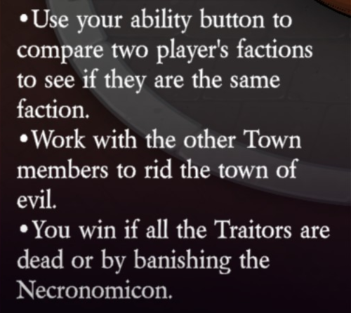 Uses their ability button to compare two player’s factions to see if they are the same faction (5 uses, 45 second cooldown).