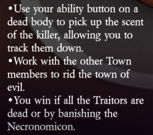 Uses their ability button on a dead body to pick up the scent of the killer, allowing them to track them down (via Spectro Hound, only seen by the Tracker, unlimited uses, ~10 second duration, ~30 second cooldown).
