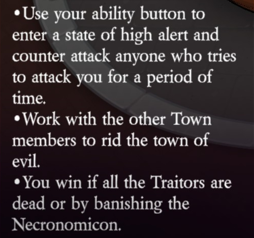 Uses their ability button to enter a state of high alert and counter attack anyone who tries to attack them for a period of time (unlimited uses, ~5 second duration, ~20 second cooldown). While on high alert, if attacked by a Necromancer’s minion, they will kill the Necromancer’s minion and not the Necromancer.