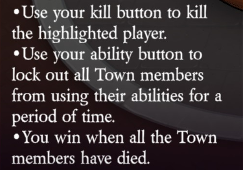 Uses their kill button to kill the highlighted player (unlimited uses). Uses their ability button to lock out all Town members from using their abilities for a period of time.
