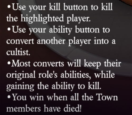 Uses their kill button to kill the highlighted player (unlimited uses). Uses their ability button to convert another player into a cultist. Most converts will keep their original role’s abilities, while gaining the ability to kill.
