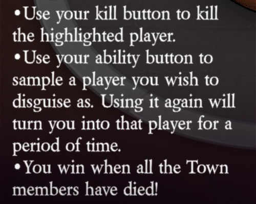 Uses their kill button to kill the highlighted player (unlimited uses). Uses their ability button to sample a player they wish to disguise as (unlimited uses, ~20 second cooldown). Using it again will turn them into that player for a period of time (unlimited uses, ~15 second duration).