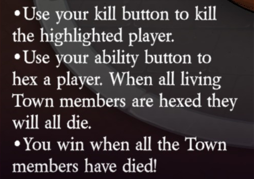 Uses their kill button to kill the highlighted player (unlimited uses). Uses their ability button to hex a player (unlimited uses). When all living Town members are hexed they will all die.