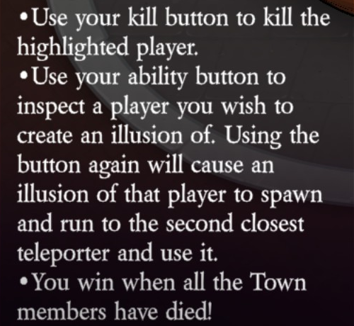 Uses their kill button to kill the highlighted player (unlimited uses, ~30 second cooldown). Uses their ability button to inspect a player they wish to create an illusion of (unlimited uses, ~15 second cooldown). Using the button again will cause an illusion of that player to spawn and run to the second closest teleporter and use it (unlimited uses, no duration). Illusion is shown as a Traitor to other Traitor roles. If a Vigilante shoots an illusion, the illusion will be destroyed. If the illusion is investigated, it will show the results of the actual player the illusion is based off of.