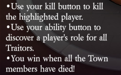 Uses their kill button to kill the highlighted player (unlimited uses). Uses their ability button to discover a player’s role for all Traitors (unlimited uses, no duration).