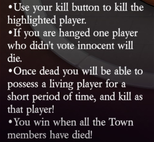 Uses their kill button to kill the highlighted player (unlimited uses). If they are hanged one player who didn’t vote innocent will die (via Doom: automatically). Once dead they will be able to possess a living player for a short period of time (unlimited uses, 10 second duration, 30 second cooldown), and kill as that player! (unlimited uses, 30 second cooldown).