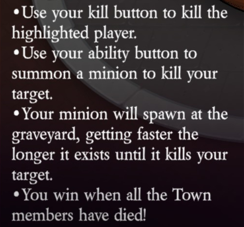 Uses their kill button to kill the highlighted player (unlimited uses). Uses their ability button to summon a minion to kill their target. Their minion will spawn at the graveyard, getting faster the longer it exists until it kills their target. If the minion attacks a Veteran on high alert, the minion will die and the Necromancer won’t.