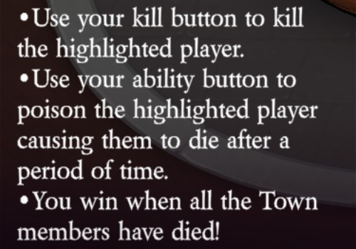 Uses their kill button to kill the highlighted player (unlimited uses). Uses their ability button to poison the highlighted player causing them to die after a period of time.